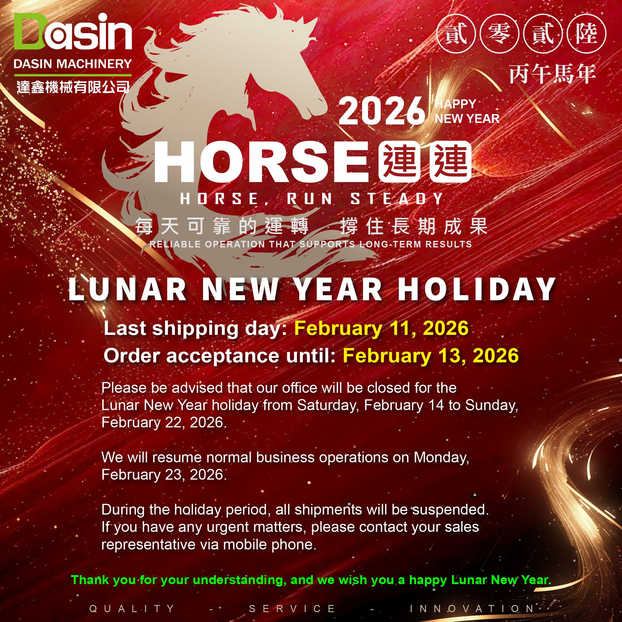 2026 Lunar New Year Holiday Notice | Made in Taiwan Commercial Juicers & Shaking Machines for Beverages and Drinks Manufacturer | Dasin Machinery Co., Ltd.