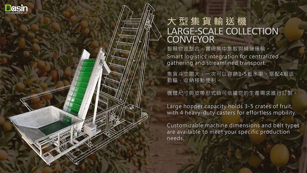 3. Transporte Inteligente: Función de Transportador de Recolección a Gran Escala: Integración logística inteligente para la recolección centralizada y el transporte optimizado. La gran capacidad de la tolva sostiene de 3 a 5 cajas de fruta, con 4 ruedas de alta resistencia para una movilidad sin esfuerzo. Personalización: Las dimensiones de la máquina y los tipos de cintas son completamente personalizables para satisfacer sus necesidades específicas de producción.