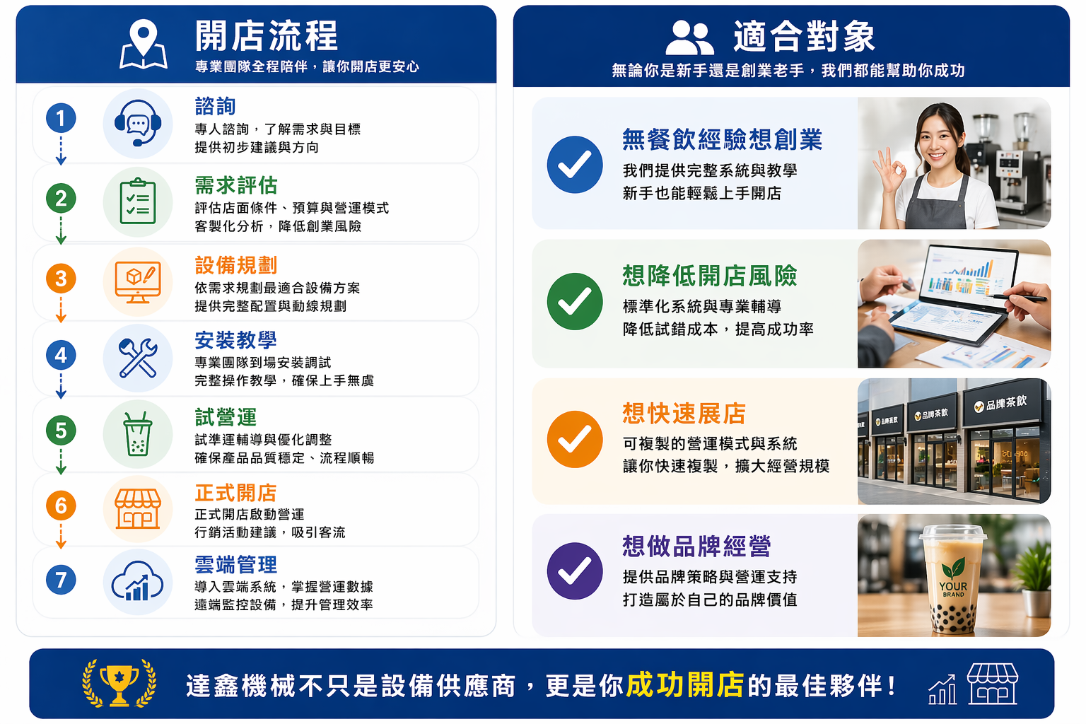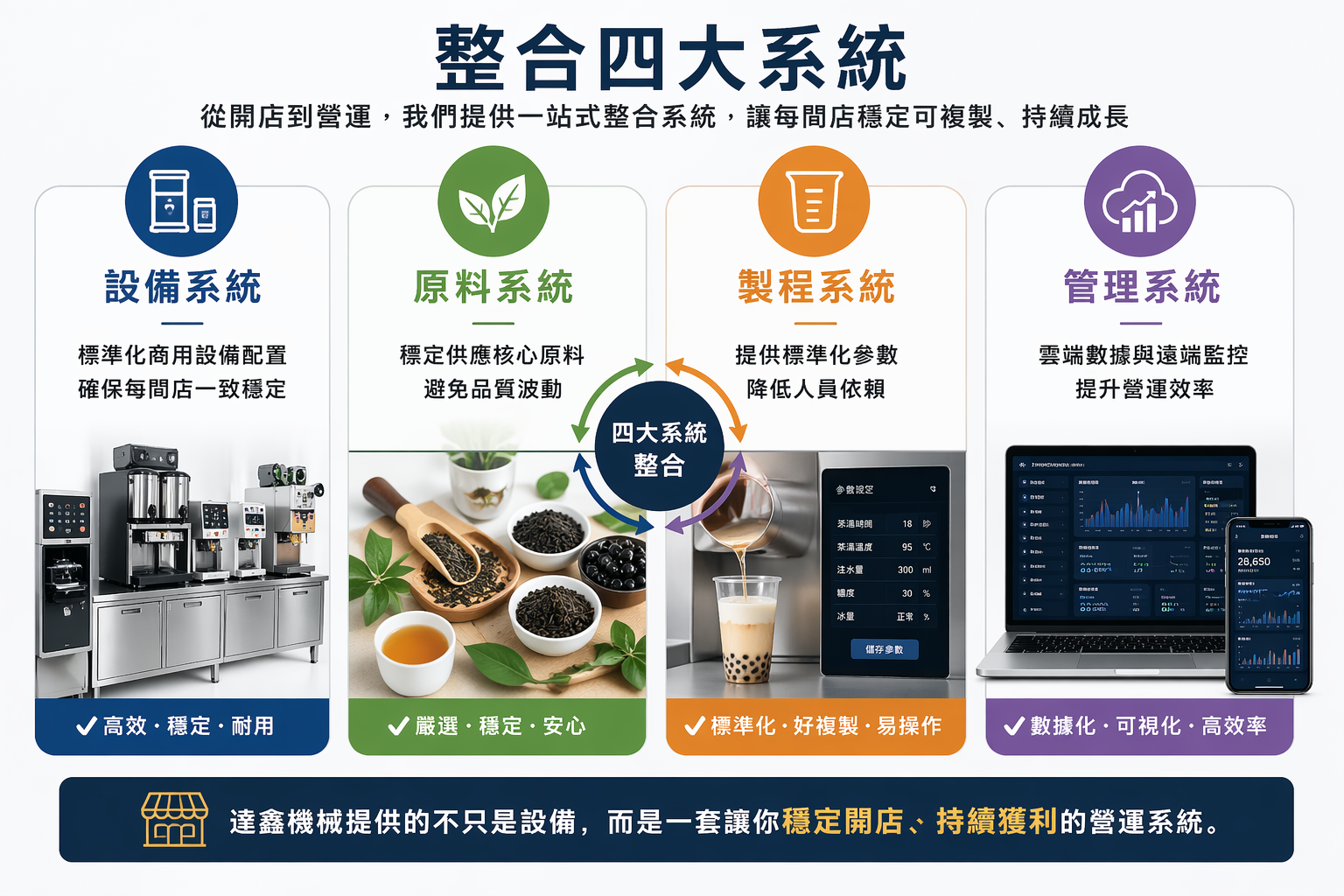 在連鎖茶飲的賽道上,單打獨鬥的時代已經過去。達鑫機械透過智慧化設備與數據整合,將繁瑣的製茶工藝轉化為「可標準化、可複製、可擴張」的商業模式,協助品牌從 1 到 100 快速穩健擴張的營運模式。