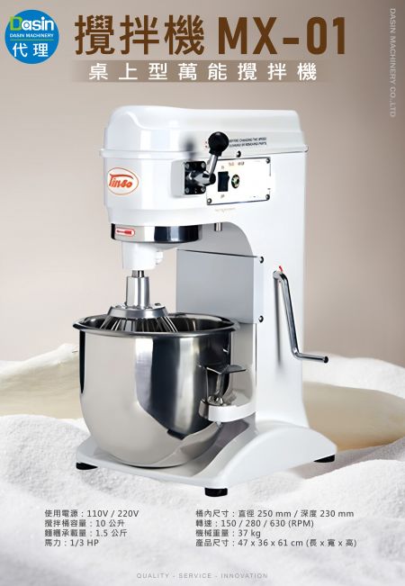 代理商品 MX-01 桌上型專業攪拌機,採用 1/3 HP 強力馬力配合精密齒輪傳動,機械結構堅固、操作穩定性高。體積精巧不佔空間,37公斤實機重量確保高速運轉不搖晃。配備專屬不鏽鋼攪拌勾、扇、球三件組,無論是揉捻麵糰、混合內餡或是蛋白打發均能輕鬆勝任。高品質不鏽鋼配件符合食品衛生標準,是烘焙工作室、咖啡廳、甜點店提升產能與產品形象的最佳助手。