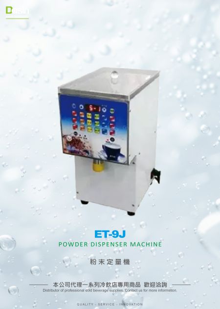 代理商品ET-9J粉類定量機,生手容易操作,品質口味統一,全機台不鏽鋼製造,給粉快速,約1至3秒,不結塊,易清潔保養,電腦化定量自行設定,誤差 ±1%,全省維修據點,使用有保障。